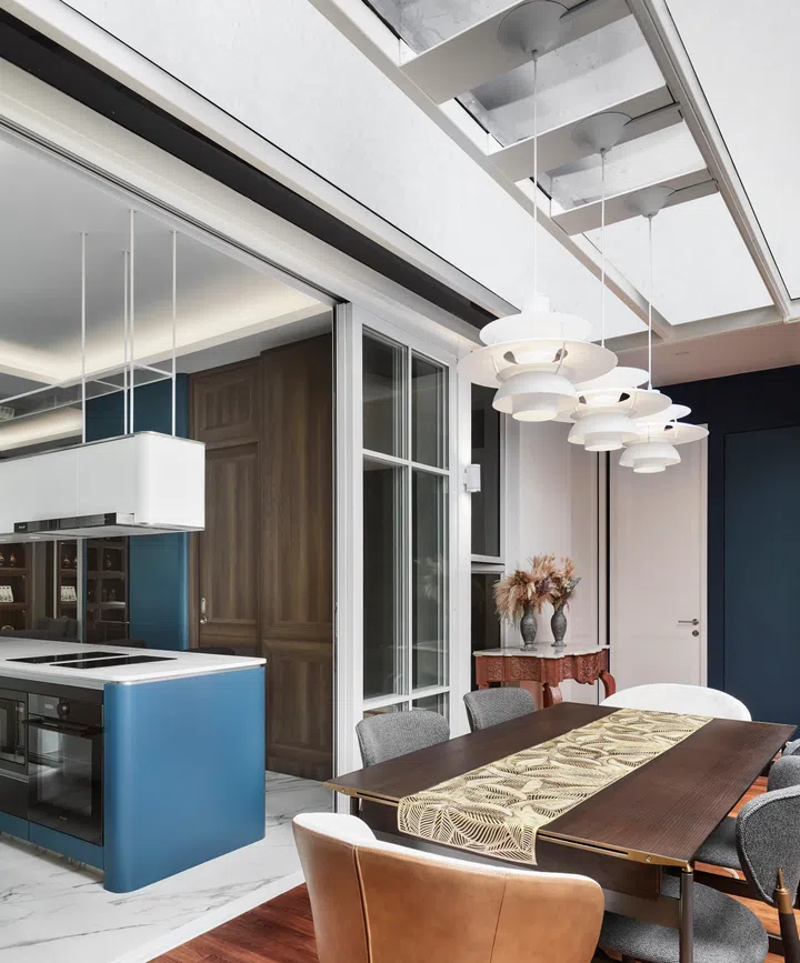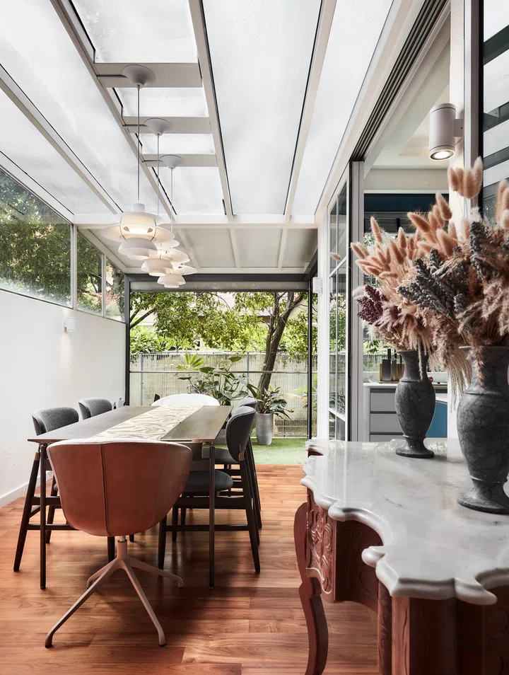 With the existing wall between the dining room and former guest bedroom removed, the new dining room and kitchen now have a more seamless connection. This almost did not materialise as the construction team discovered steel reinforcement bars in the wall during demolition, indicating the possibility that it could be a structural wall.