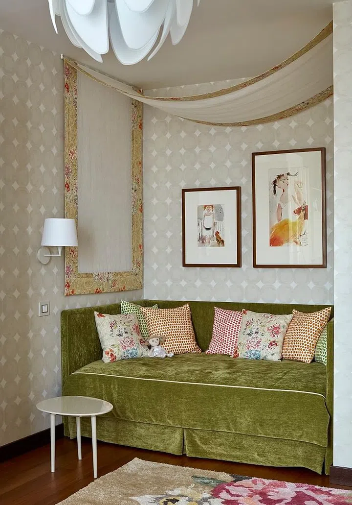 Veronika is known for her flair for combining colours, as well as her approach to textile artwork -- both of which is displayed in this cosy nook of the apartment.