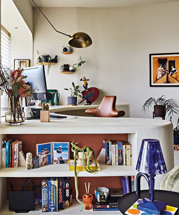 One of the bedrooms has been converted into an open study. With the walls hacked away, the study and adjacent living room read as one large space. Visually connecting the two are the sweeping arcs of the custom-built, reinforced concrete work desk that was built over an existing bay window, and the curved Tacchini sofa from Made & Make.