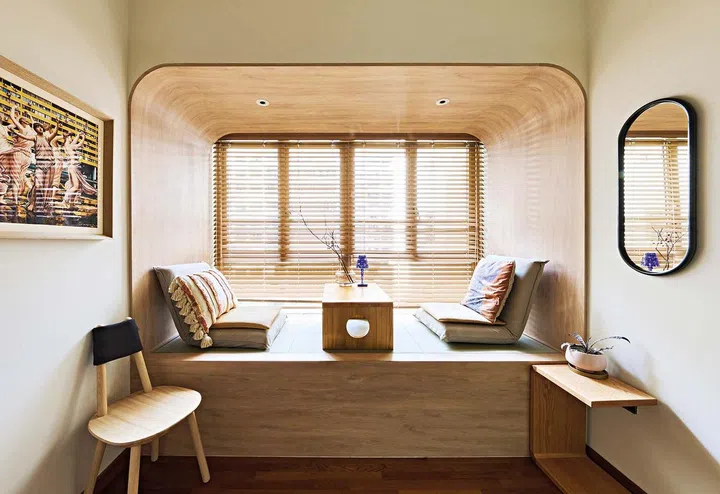 The guest bedroom pays homage to the Japandi style that Haikal originally wanted. A tatami platform was built over an existing bay window. The Zen setting with a view of the swimming pool is perfect as the room is also where Haikal reads or takes work calls.