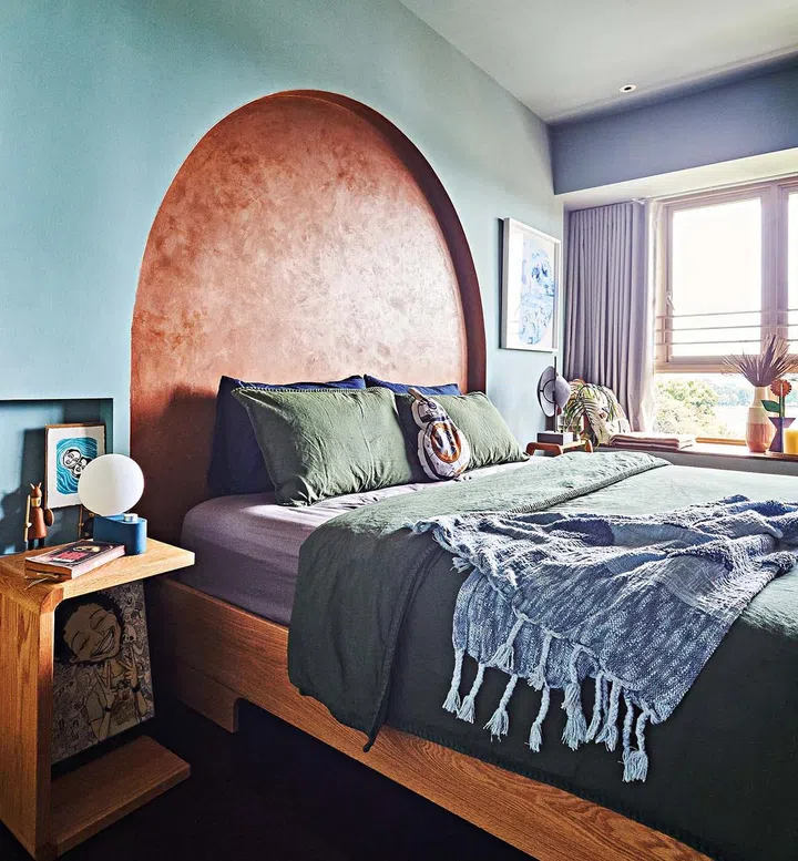 The arched design of the headboard echoes the curves throughout other areas of the home.