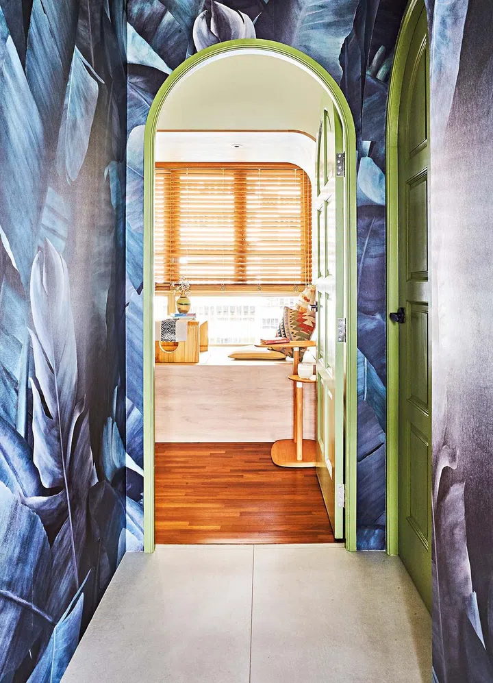 The green curtains and doors, along with the botanical wallpaper imbibe nature, creating a tranquil and restful feel as you cross the threshold into the more private spaces within the home.