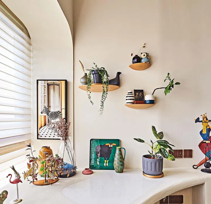 Cute floating ledges provide the ideal display space for the owner's personalobjects.