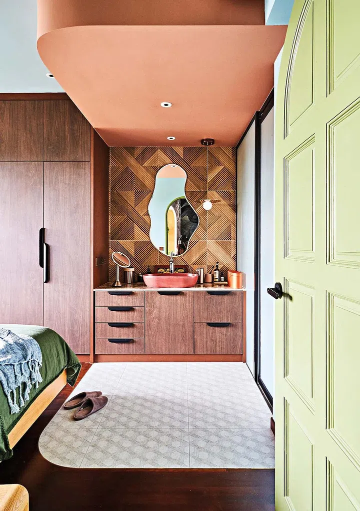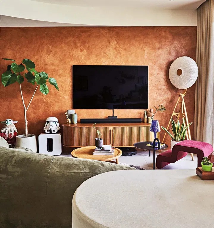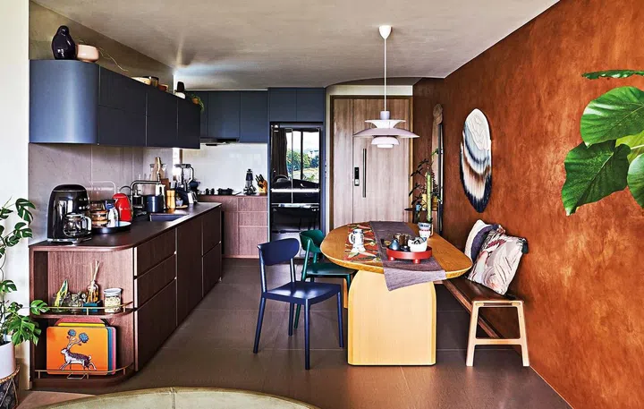 The wall that extends from the main entrance to the dining and living rooms is finished in a terracotta limewash, terracotta being one of Haikal's favourite colours besides green and blue. “I love the colour and texture, and how organic and raw it looks. It makes the home feel earthy and warm,” he says.
