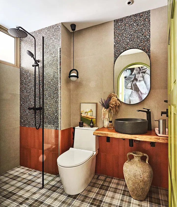 The burnt earth tone is a personal favourite of the homeowner, while the green and blue hues tie in with the view of the reservoir and greenery outside.