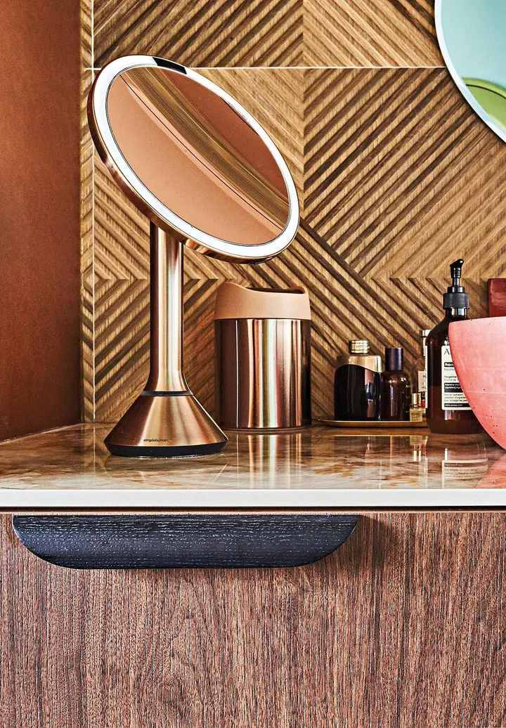 The organic shape of the mirror above the vanity provides an interesting contrast to the symmetry of the wall's marquetry design.