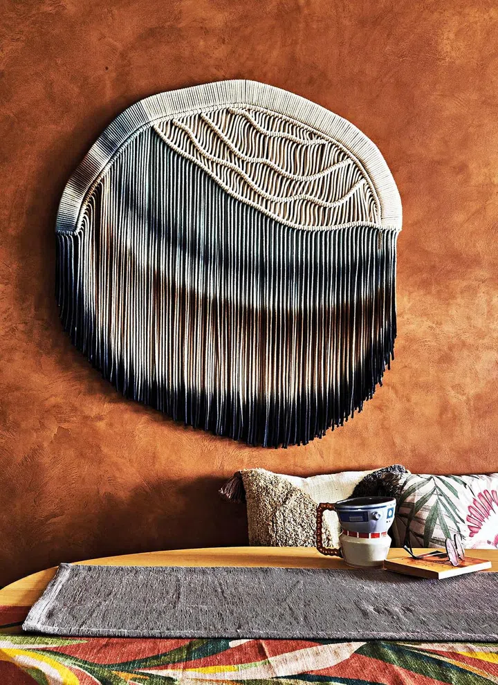 A handwoven wallhanging with rustic ombre effect adds a perfect finishing touch to the final look of the living area.