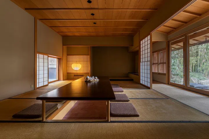 To further appreciate the view, head into the adjacent Japanese pavilion with a traditional tea ceremony room. The room is furnished with tatami mats and shoji sliding doors that open to the koi pond.