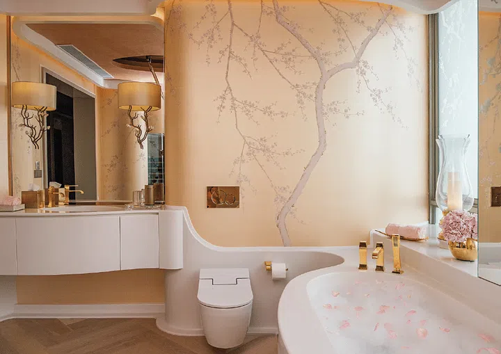 This Hadid-inspired bathroom features fluid lines and plenty of natural elements, creating a space that calms the mind and soul.