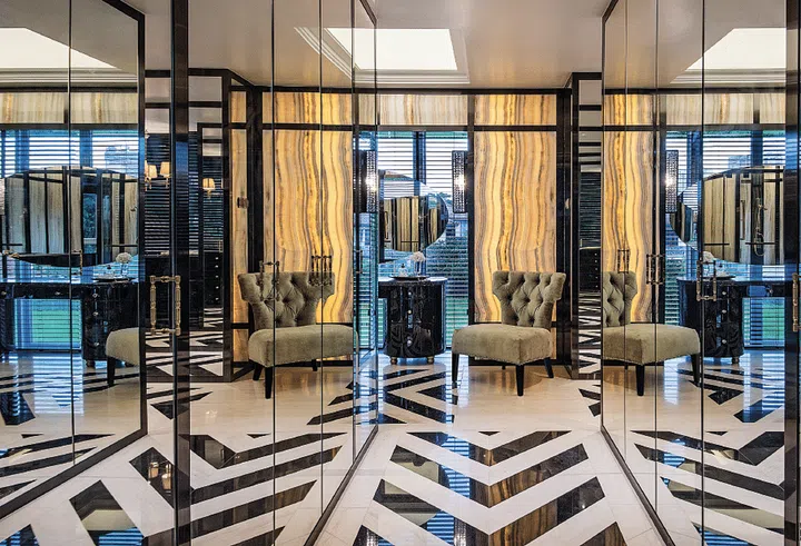 Full-length mirrors in this walk-in wardrobe turn the space into an endless fashion runway.