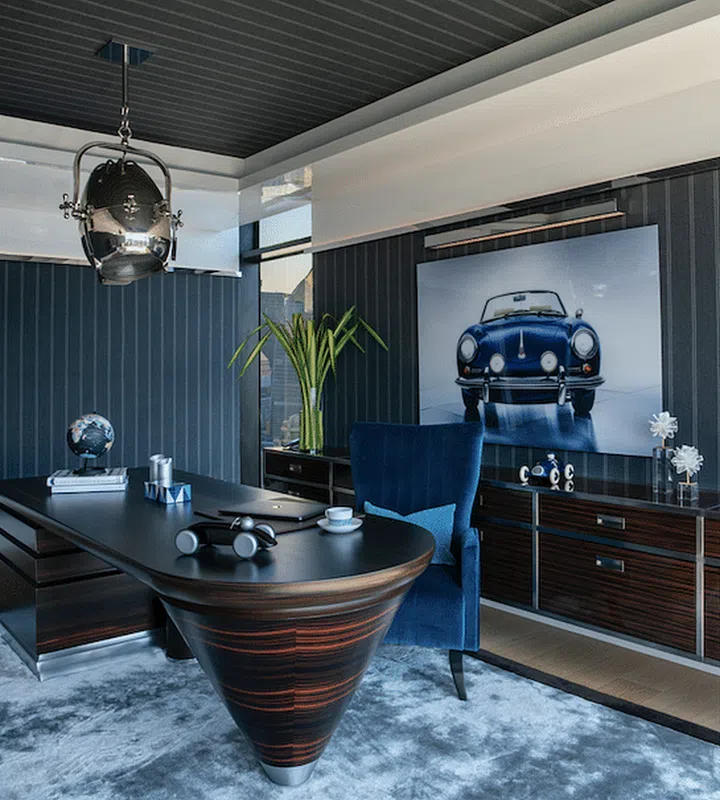Sleek contemporary lines are paired with vintage elements in this home office inspired by Ralph Lauren.