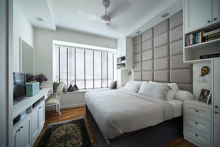 A full-height quilted headboard lends an element of luxury to this bedroom.