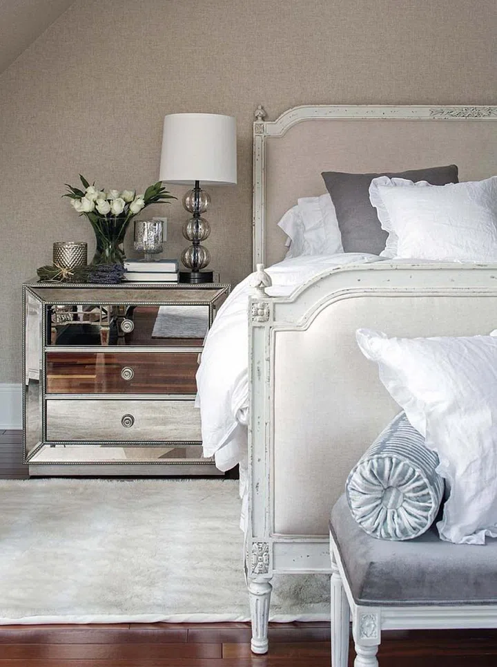 A mirrored nightstand pairs surprisingly well with this vintage four-poster bed in a New Jersey apartment where Art Deco and French influences meet.