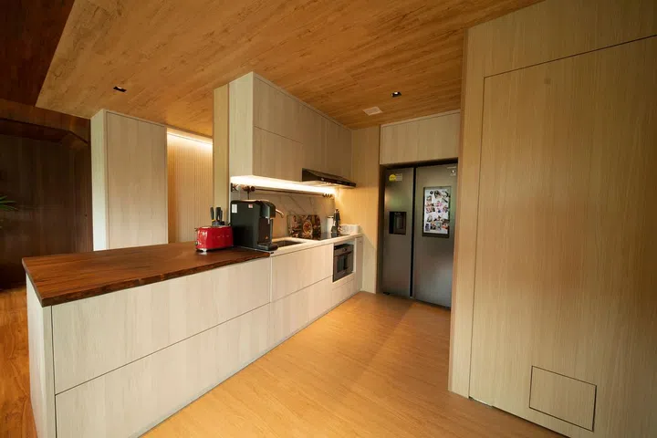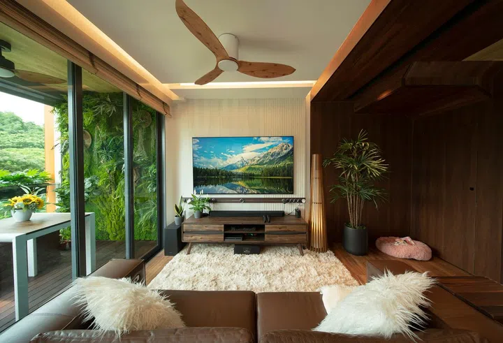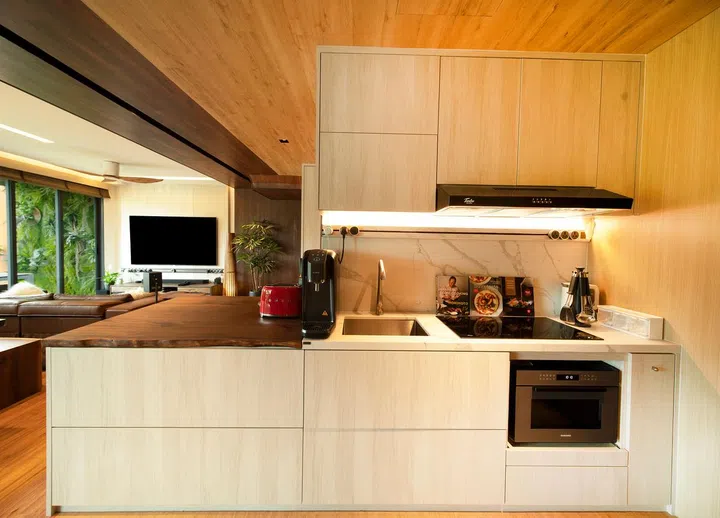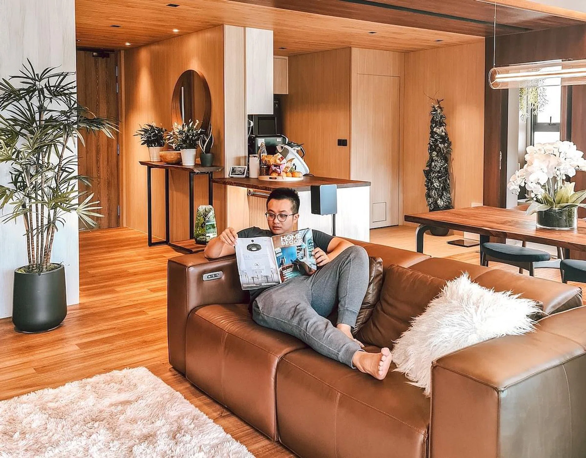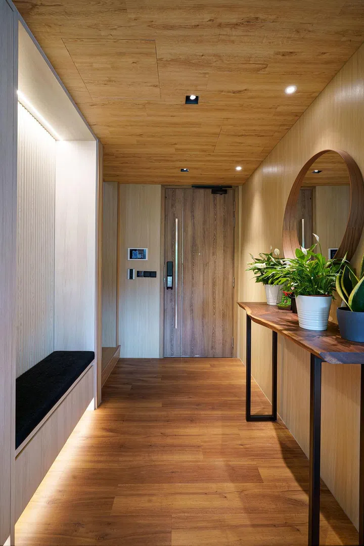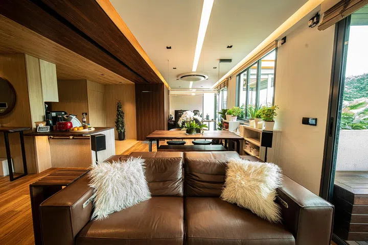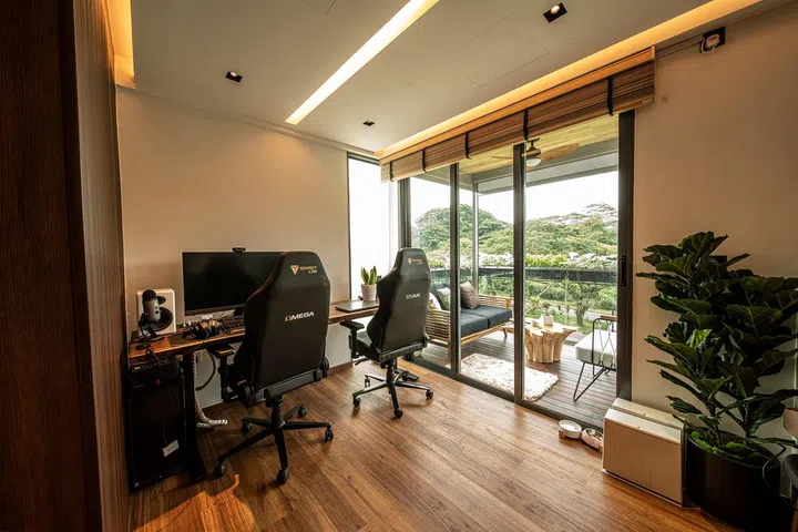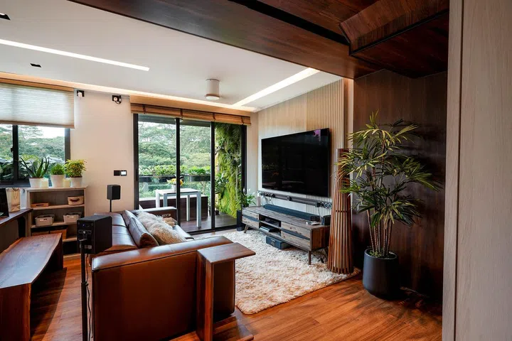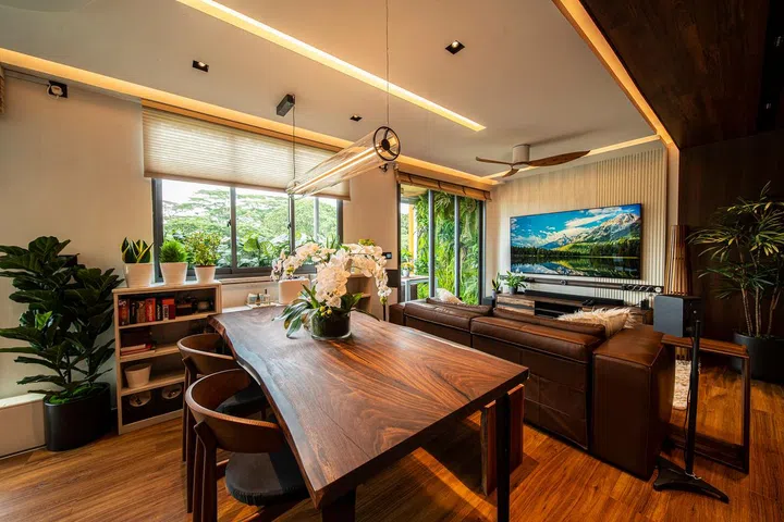 Stepping into the home of Night Owl Cinematics' co-founder Ryan Tan feels like setting foot in a tropical resort, thanks to the wooden accents and botanicals that dominate the space. The two-storey penthouse, situated in Floraville, Yio Chu Kang near Seletar, was conceptualised by both Ryan himself and The Designer Inn, which he selected after meeting with a total of eleven designers.