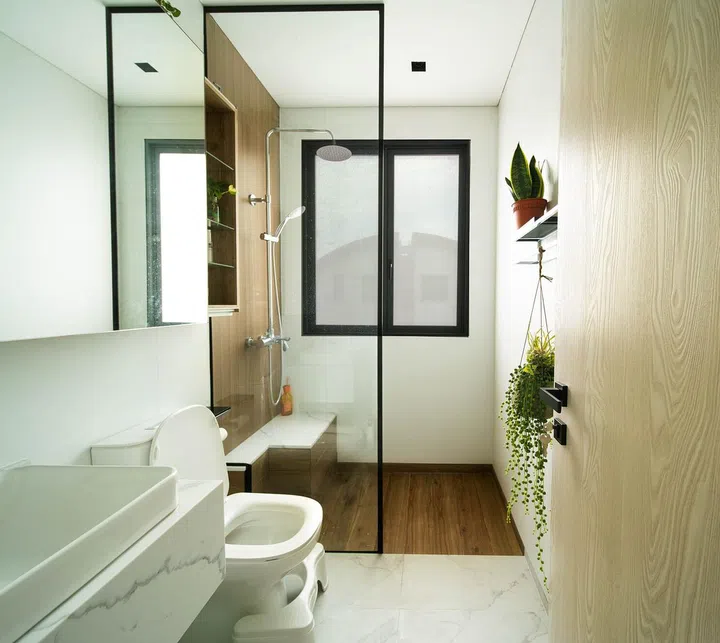A window lets natural light through to brighten the master bathroom. The choice of wood in the shower area was inspired by Japanese bath houses, since Ryan wanted to differentiate the main bathroom area from the shower. Here, Evorich vinyl is used instead of real wood, which can warp in wet environments.