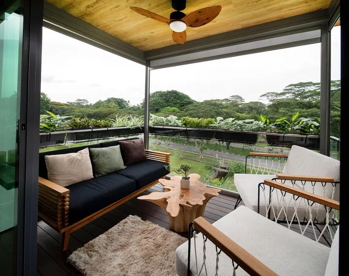 The outdoor furniture for the balcony is by Rooma, which Ryan had stumbled upon at Tan Boon Liat Building when shopping for sofas. Here, a live-edge table complements the outdoor greenery and prevents the space from looking too boxy.