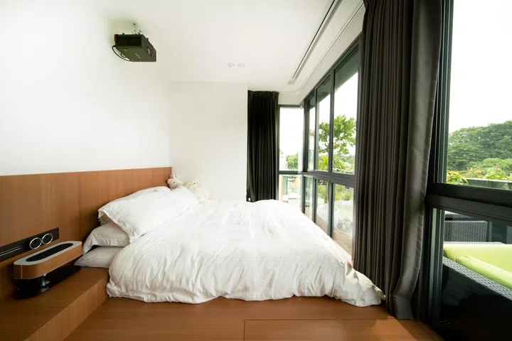 The bedroom's generous windows overlook an expanse of greenery outside. Ryan can also sit up in bed, thanks to the adjustable bed frame and mattress by Woosa on a platform.