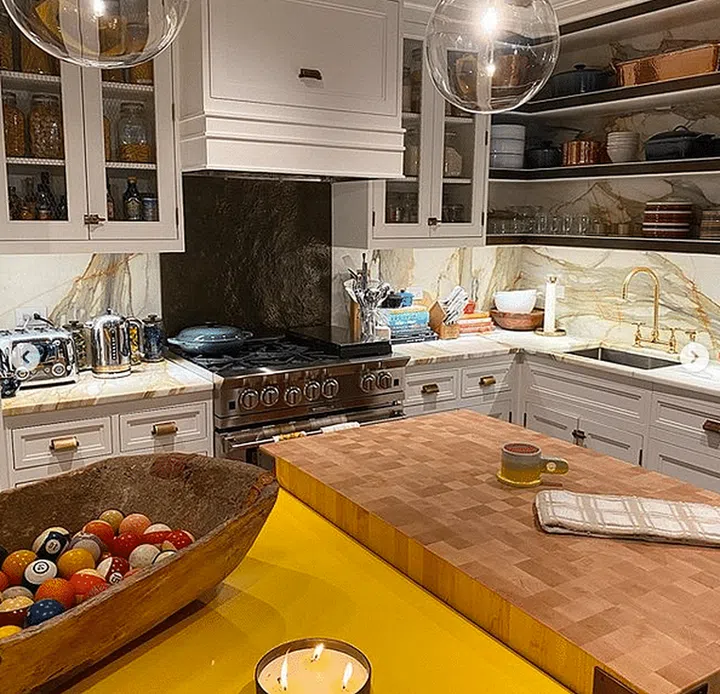 Alternatively, have them stored in jars for a kitchen shelfie? Another unusual element of her kitchen island is a bowl of billiard balls that doubles as a centrepiece.