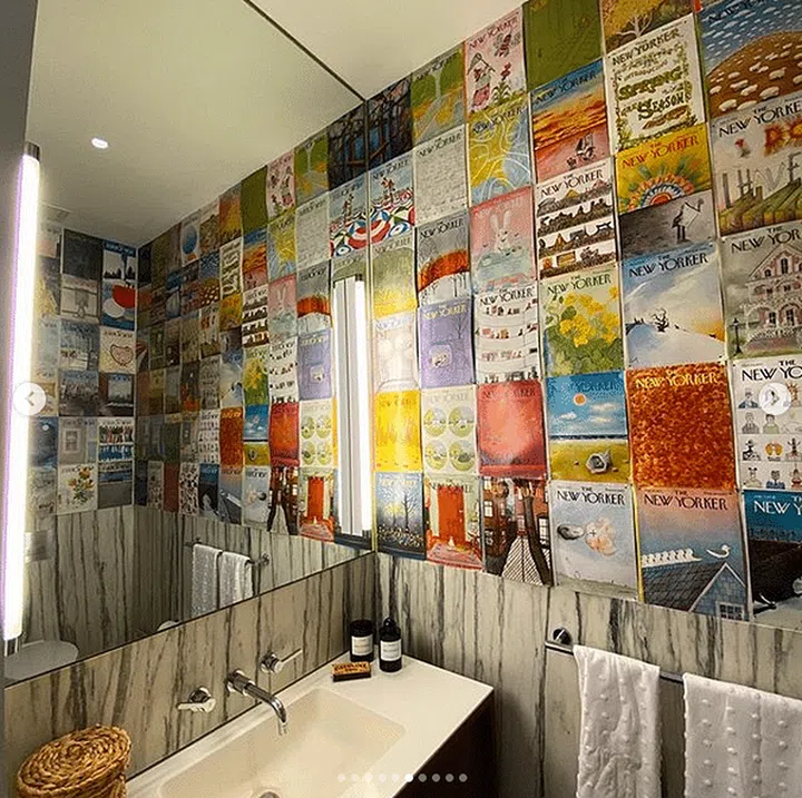 Her bathroom features quirky details too, with a wall plastered in The New Yorker magazine covers. Points for creativity, but we'd have them framed up instead of tacked to the wall, or have one (framed, of course) giant poster-sized print for a statement piece.