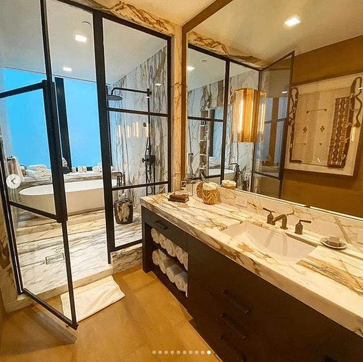 The New Yorker covers aside, the bathroom oozes sophistication with marble finishings, black frames and glass panels. Photo: Gigi Hadid's Instagram