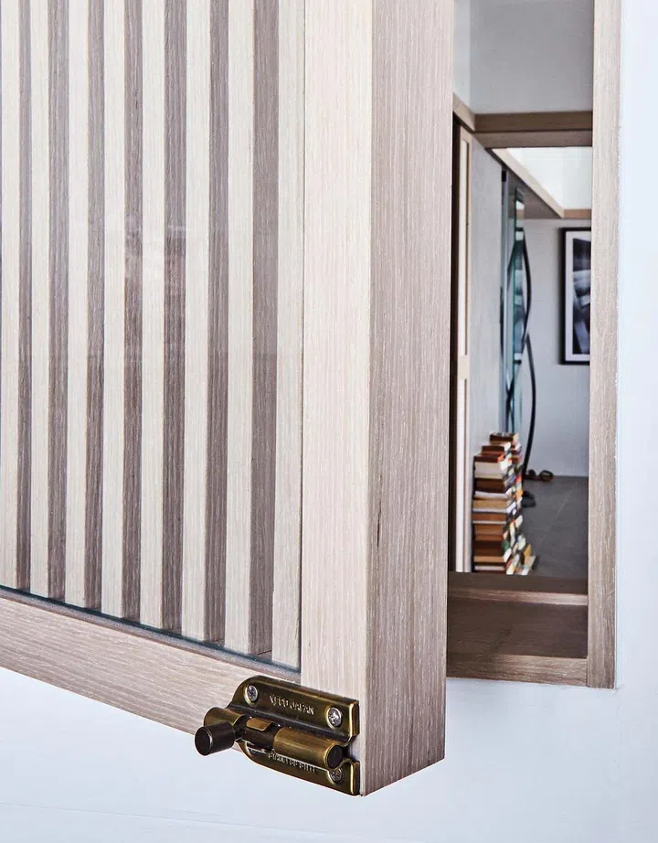 More hidden storage can be found along the wall outside the common bathroom. The concealed storage, bedroom and bathroom doors, are clad with wallpaper with rattan-like texture. It adds layered tactility to the surfaces minus the dust and warping.