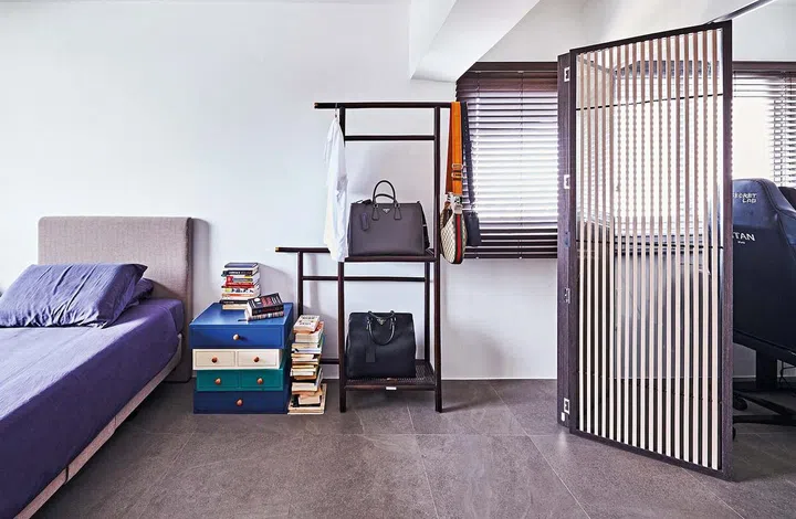 With some reconfiguration, what used to be a corridor space between the two bedrooms is now a private study area within the homeowner’s bedroom for working from home. It is separated from the sleeping area by a slide-and-fold screen door.