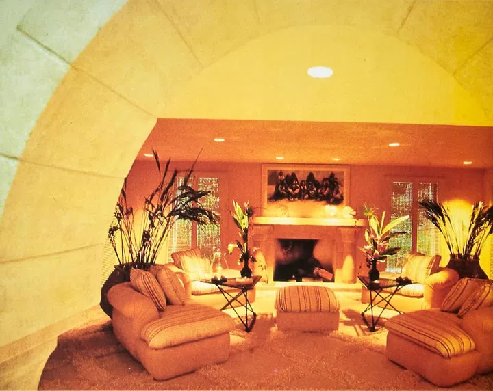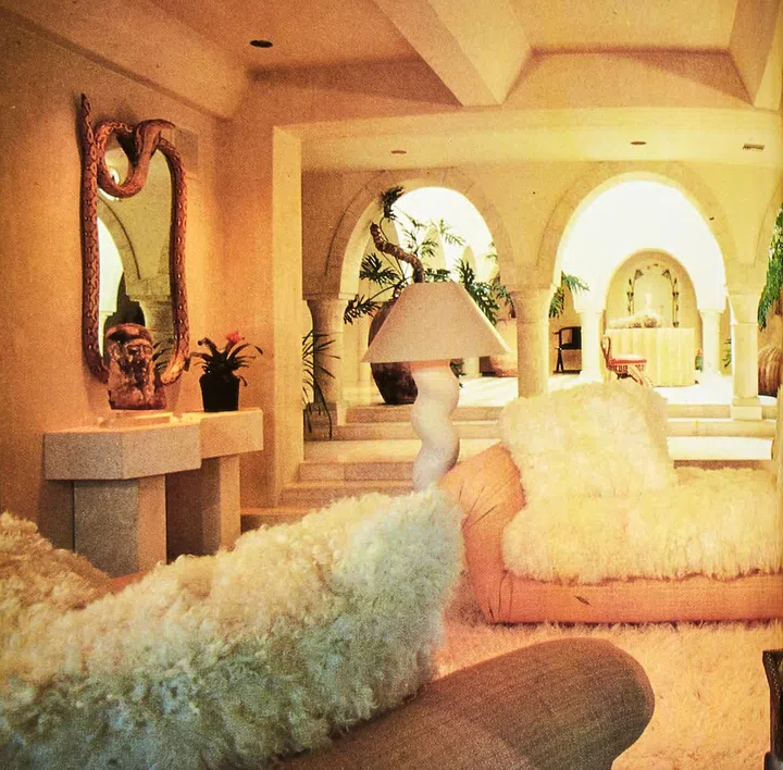 Warmth and intimacy is created with shaggy carpets and plump upholstery, along with concealed lighting to spotlight the fireplace. Houseproud Cher doesn't give showbiz parties because, "I couldn't stand people stomping cigarette butts into my carpet and spilling red wine on my couches."
