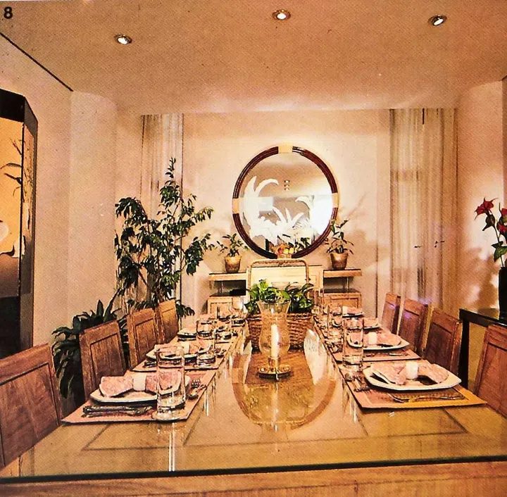 This beautiful dining table belonged to Bessie's husband's grandfather. And it's an heirloom that looks right with a table setting that is contemporary and chic. The mirror at the far end was designed by Raymond and its adds a strong finishing touch.
