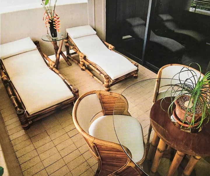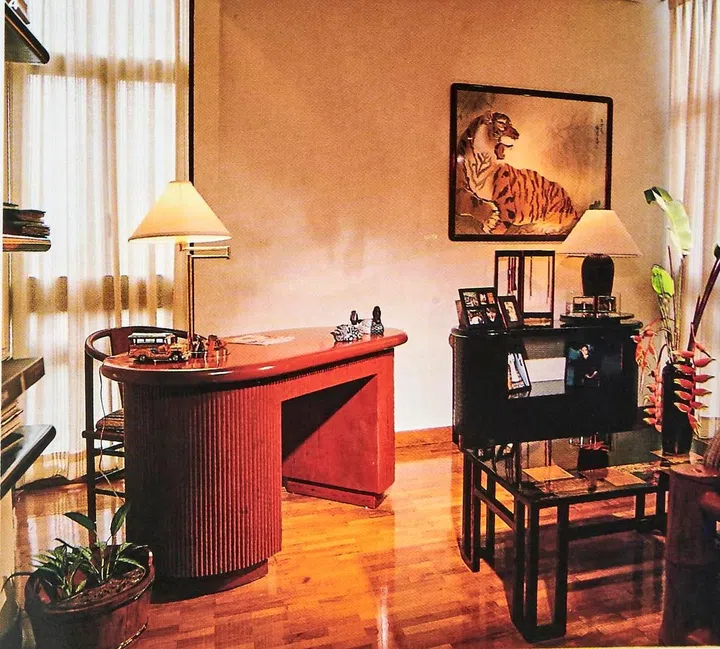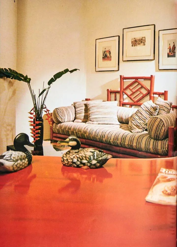 When Filipino Bessie and her husband moved to their home in the Colonnade, they engaged the aid of Manila-based architect Raymond Fuentes to design the interior of their apartment. Raymond is well-known for his use of flamboyant colours like fiery reds, which is evident in the study. The bamboo daybed was made in the Philippines.