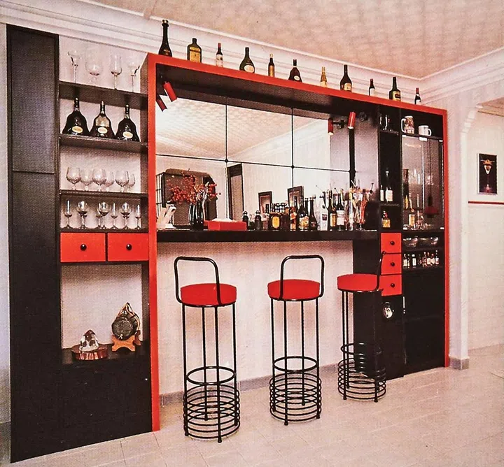 Designed by Dave and installed by a contractor, the bar counter in the living room features special built-in features like a detachable counter on castors, that can double as a side table and special cabinets for liquor. The bar stools, however, took several months to design, but they are Dave’s proudest achievement. He wanted a very high-tech look, so he designed spiralling metal stands topped by circular red cushions.