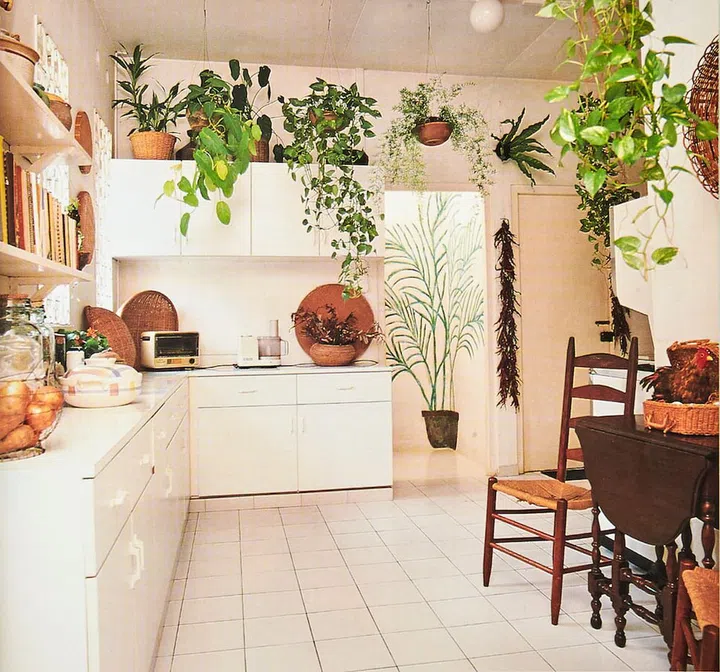 The Mediteranean-style kitchen is so inviting for a tete-a-tete. Carolyn’s cookery books fill one wall. She painted the palm in a pot because she just couldn’t get a real palm to grow in that space.