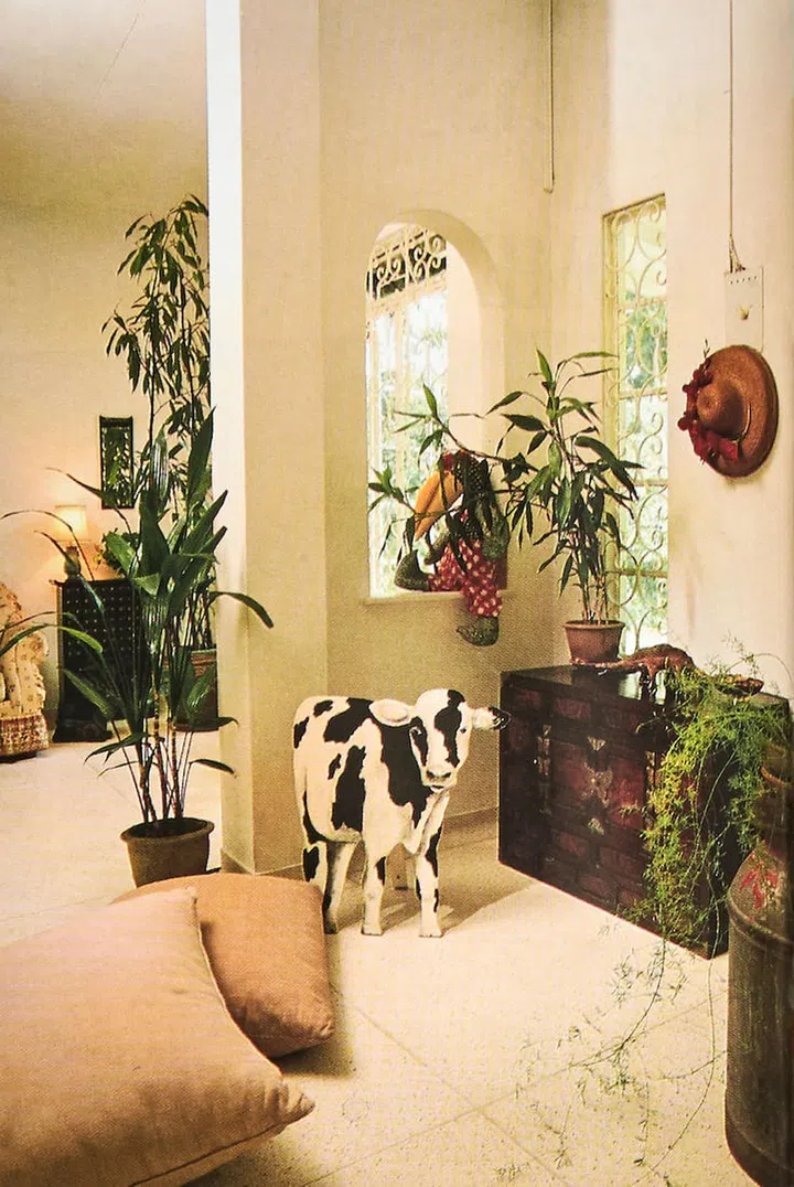 A corner of the living room where a Friesian calf makes a playful statement amid antiques and throw cushions.