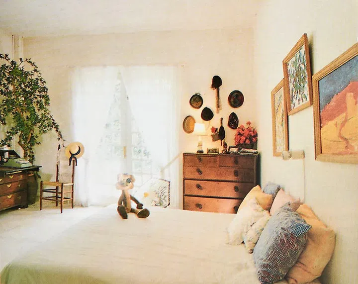 In the bedroom – a collection of caps and hats on one wall, while Carolyn’s children’s paintings hang on the adjoining wall.