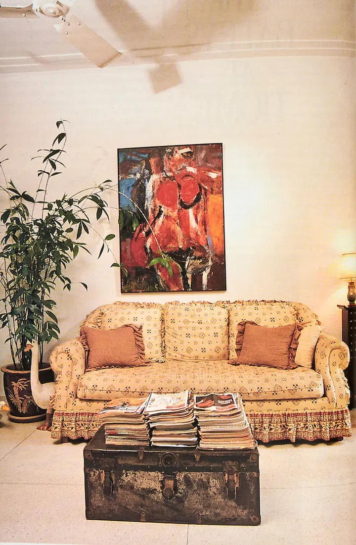 Modern art hangs above an English country sofa and an antique chest. A pair of papier-mache geese peep out of the corner.