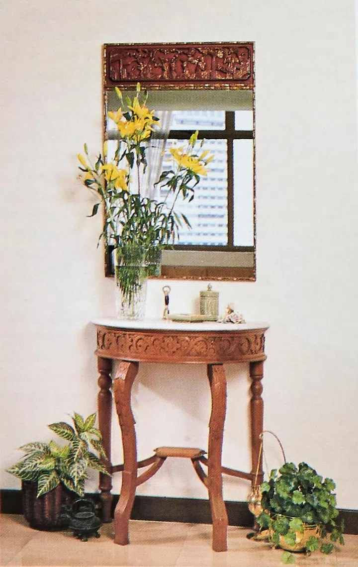 A Peranakan console table with celadon ware on top; a bamboo framed mirror with the top panel depicting a Chinese mythological theme.