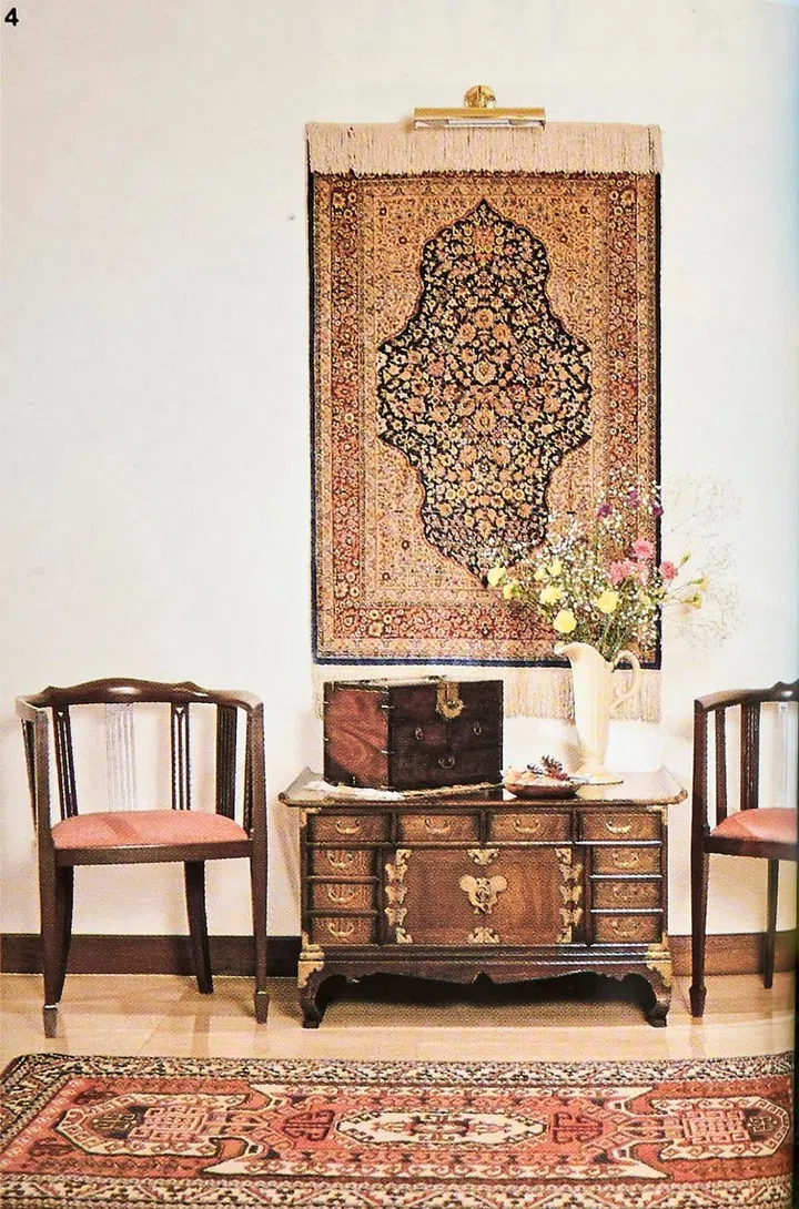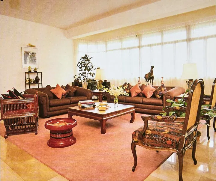 The couple decided to select dark furniture and upholstery to solve the problem. On a trip to Bangkok, they ordered armchairs and a centre table in teak wood, stained dark.