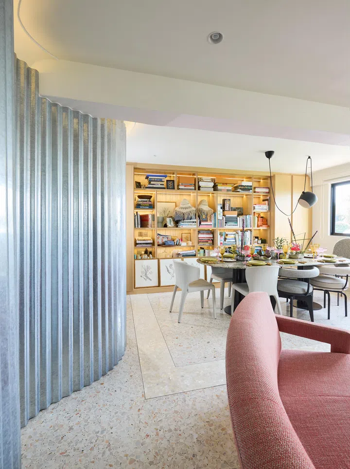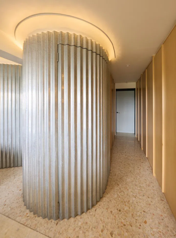 As fashion lovers, the walk-in wardrobe naturally received a lot of design attention. The standalone, metal corrugated structure strikes a monumental and monolithic presence that is visible from the living room.