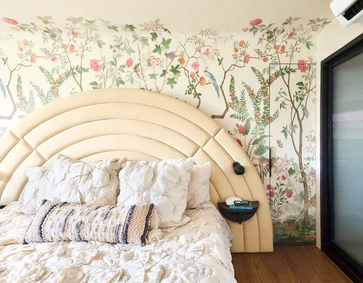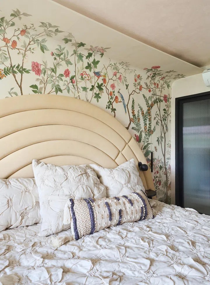 In the master bedroom, a custom-made bed by Danovel sits against a Gucci wallpapered backdrop.