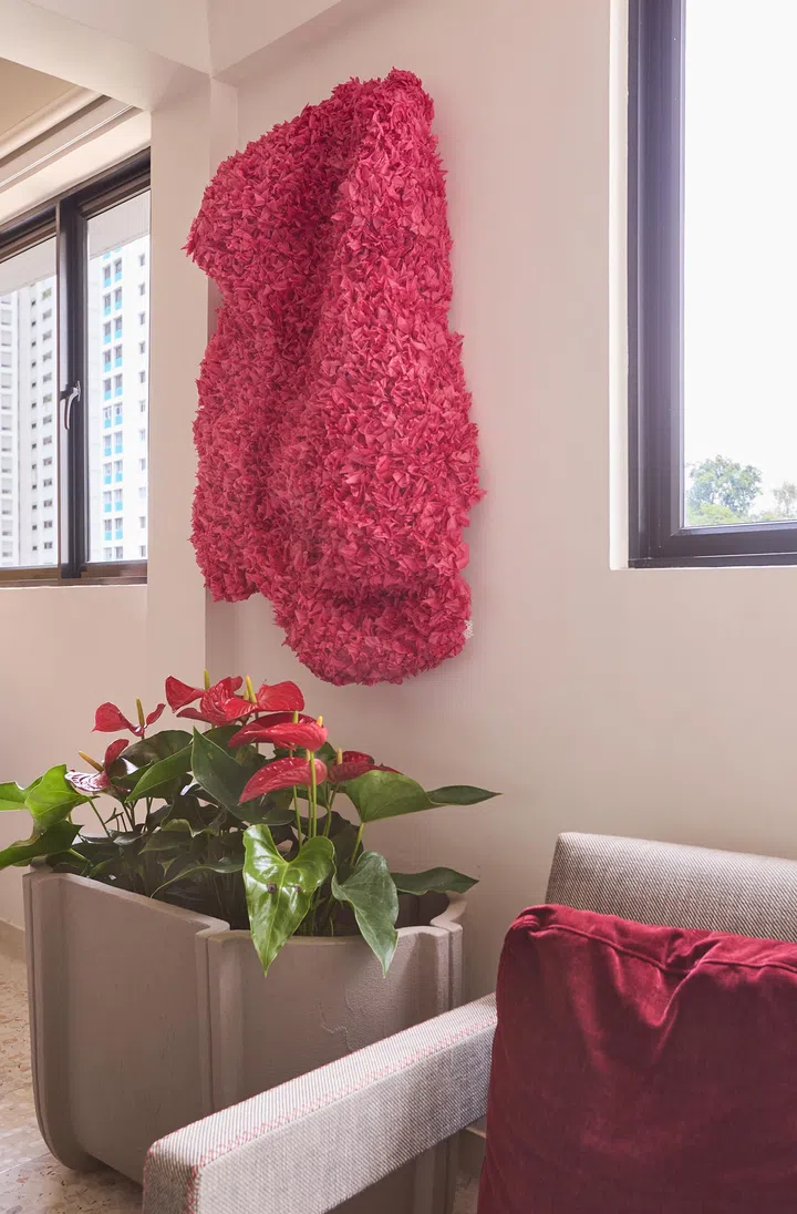What you see within the home is just a fraction of their collection, which includes not just art, but also sofas and light fixtures. A lot of the art works are in climatically controlled storage. As the flat does not have a lot of wall space, they decided to focus on art that relate to the tropical environment and to Singapore, in terms of its landscape and flora.