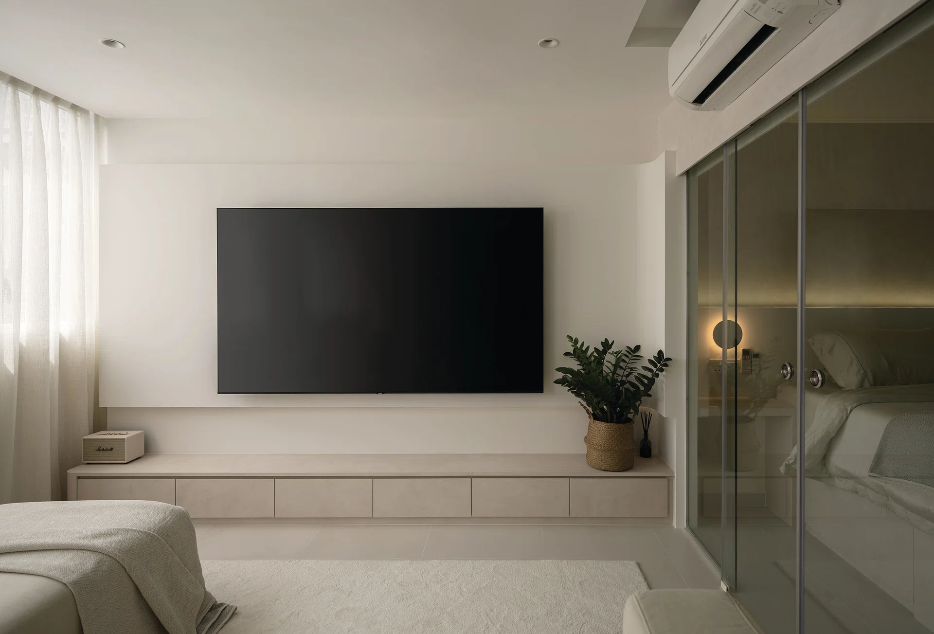 With just the two of them living in the flat, the couple only needed one bedroom. As they wanted to have a big television set, it was decided that one of the bedrooms be opened up and converted into a living room and television room. It is separated from the master bedroom by sliding glass doors that make it feel like an antechamber to the bedroom where the couple can lounge and watch television.