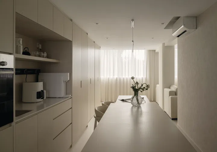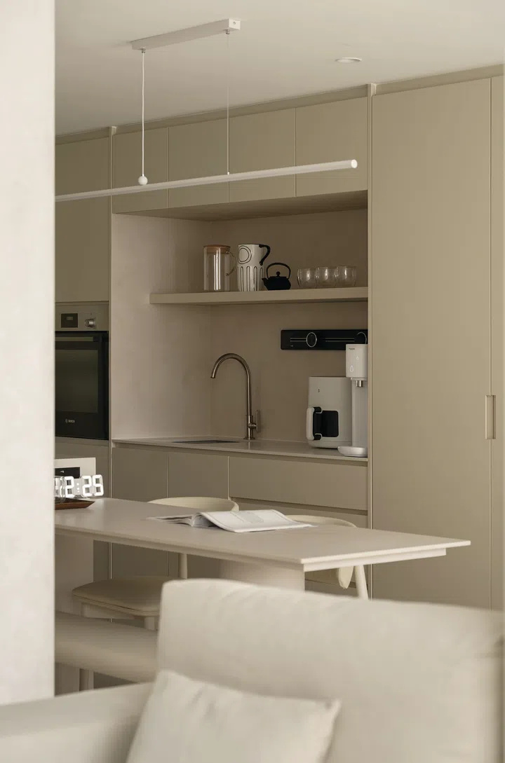 The rectilinear kitchen has been divided into a wet and dry kitchen separated by bi-parting glass doors. The dining table is positioned side-by-side with a higher island to create a long, two-tier, central fixture that anchors the open-concept space. A series of floor-to-ceiling cabinets, drawers, shelves, a countertop and sink make up the pantry that provides convenient access to water and drinks without having to enter the wet kitchen.