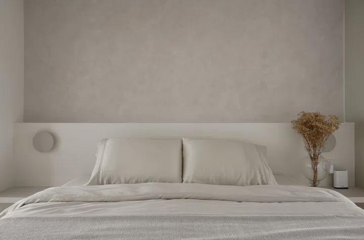 In the master bedroom, Simon and KS designed a customised bedframe to suit the interior theme. This is complemented by a limewashed bedhead. They managed to carve out space for a walk-in wardrobe with His and Hers wardrobes flanking either side, both sporting rounded edges that tie in with the rest of the home. The attached master bathroom possesses a limestone cave-like quality that is tranquil and meditative, perfect for a relaxing and restorative shower after a long day.