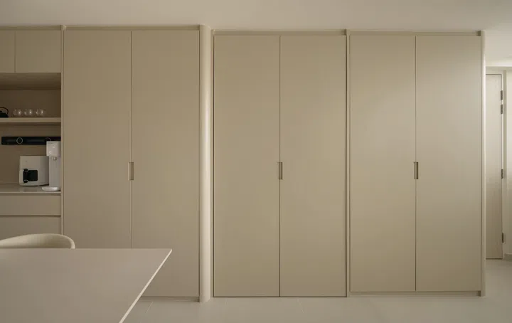 The couple also have a preference for curved edges and wanted everything to be hidden so that the house will always look neat and tidy. This is evident right from the entrance foyer where a series of full-height, built-in cabinets with rounded corners provide ample storage for shoes and other household items, while also concealing the DB electrical box.