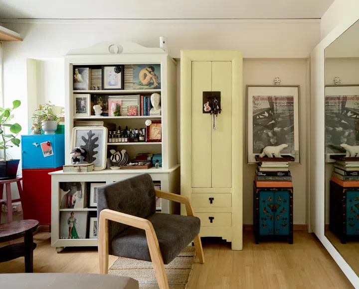 The cream-toned hutch cabinet is flanked by two contrasting characters: on one side, a bold red-and-blue metal cabinet that adds a graphic jolt; on the other, a tall, pale yellow wardrobe with vintage lines and a muted patina. The pairing is unexpectedly balanced; its old-meets-new tension offset by the playfulness of surrounding objects: a ceramic polar bear perched on stacked books, a small black lacquered drawer chest with butterfly motifs, and a low grey armchair that ties the mix together.