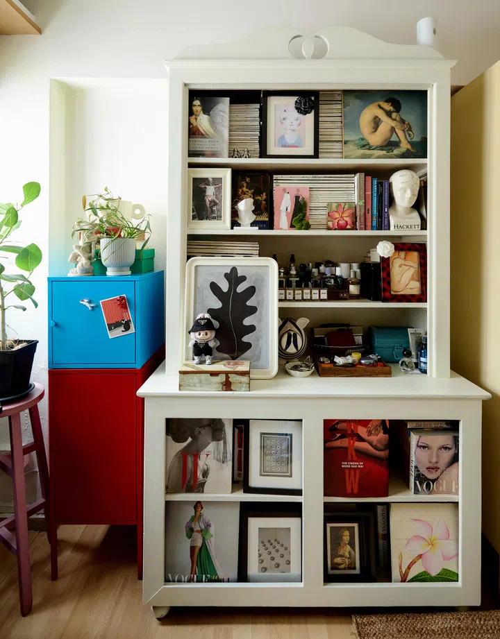 In the bedroom, a white hutch cabinet anchors the space; its open shelves styled with fashion books, art prints, and collected curios, while the glass-front base showcases magazine covers and framed photographs like a private gallery.