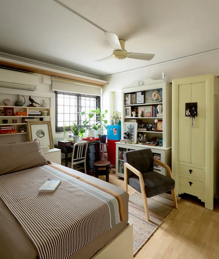 He was 35 years old when he bought this 3-room HDB flat, unfazed by his friends’ warnings about rodents and noise on the ground level. “I liked that it felt open,” he explains. He has built a mini garden right outside his metal gates. “It doesn’t feel boxed in.”