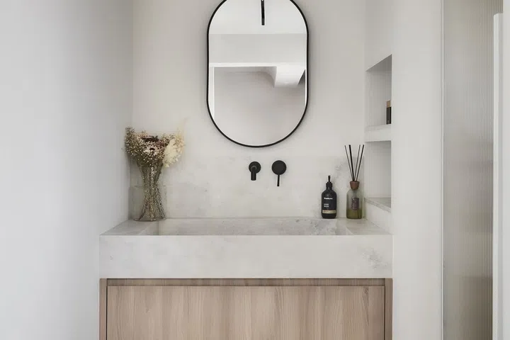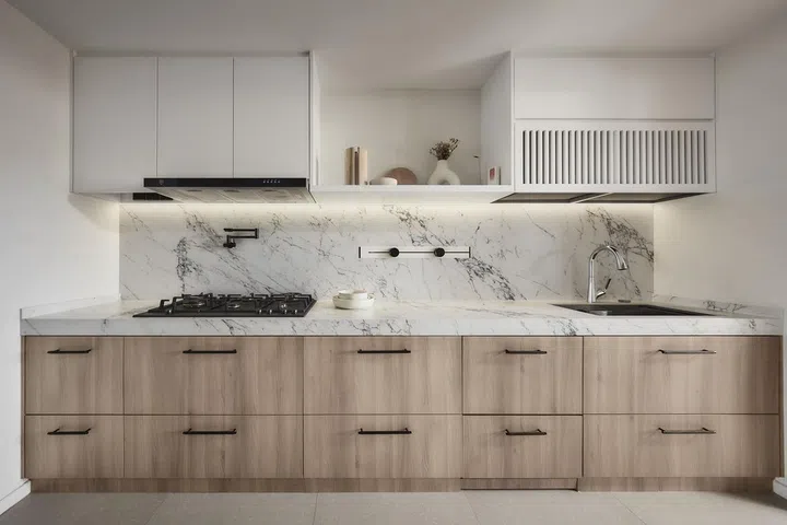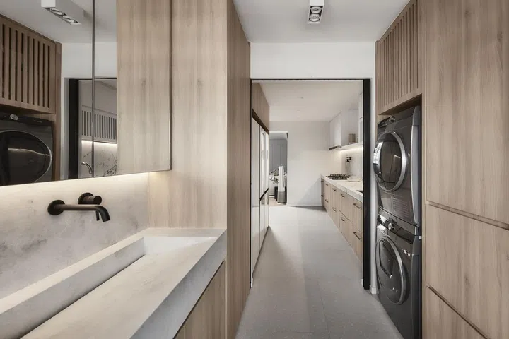 The palette of woods and whites continues in the wet kitchen. Its length makes it possible to carve out a dedicated laundry area at the end near the windows, something that the couple wanted. This is separated from the wet kitchen by bi-parting sliding glass doors. Even when these doors are closed, the glass still allows the natural light from the windows into the wet kitchen.