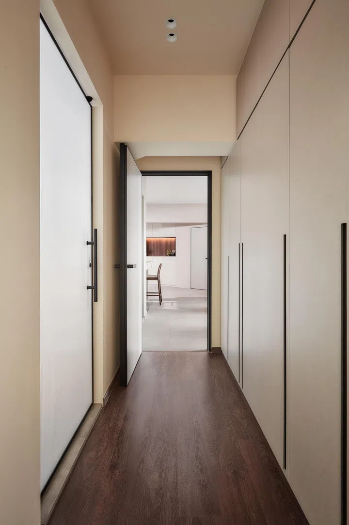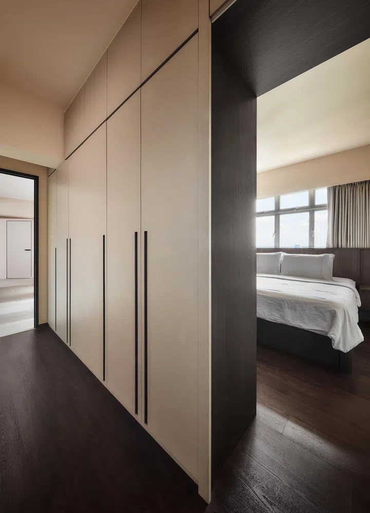 Inside the couple’s private quarters, the space opens up generously. “We were quite lucky,” Crystal smiles. “We had just enough room to create a proper walk-in wardrobe.” The wardrobe consists of six tall panels — three for each of them — and keeps everything hidden behind clean flushed doors.
