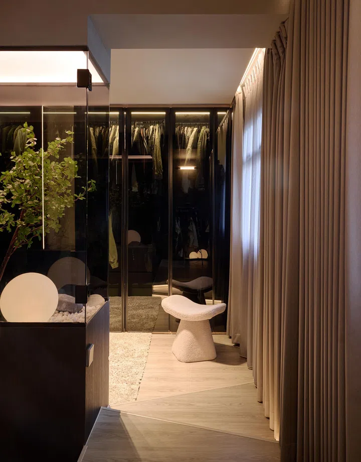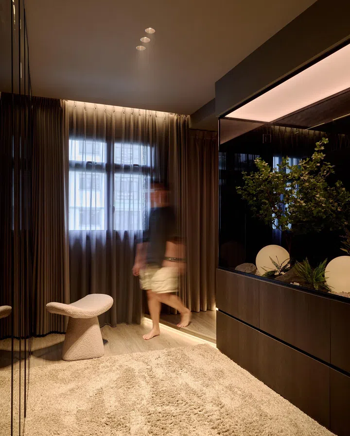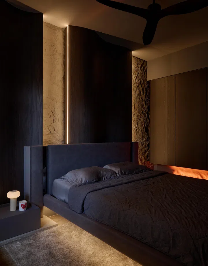 There’s no desk, no clutter, no downlight above the bed. Instead, the entire zone is wrapped in indirect lighting. “We don’t come here to do anything else,” she says. “This is just for rest.”