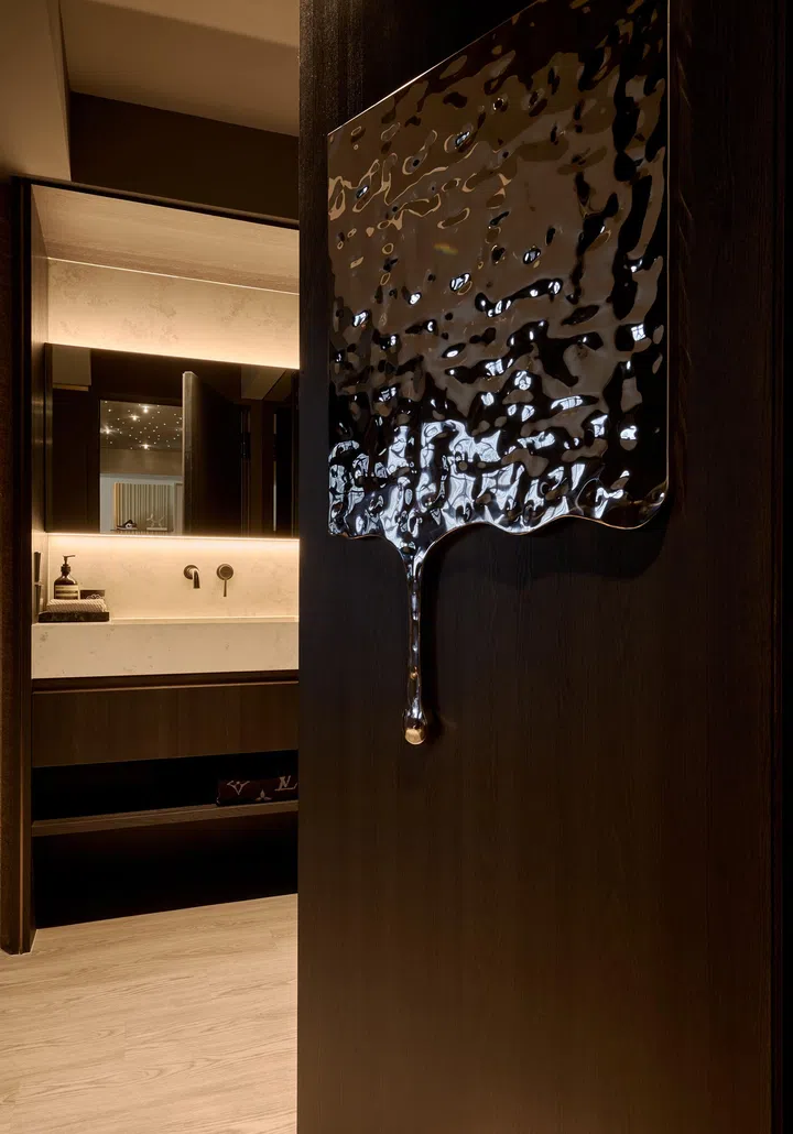 The sleeping area is set a step lower than the rest of the suite, a deliberate move to signal pause. The bed is low, finished in dark, moody linens. A built-in TV faces it directly, flanked by a warm LED strip that gives the impression of a modern hearth. “[My husband] likes watching shows before bed,” Adeline says. “So, this was always part of the plan.”